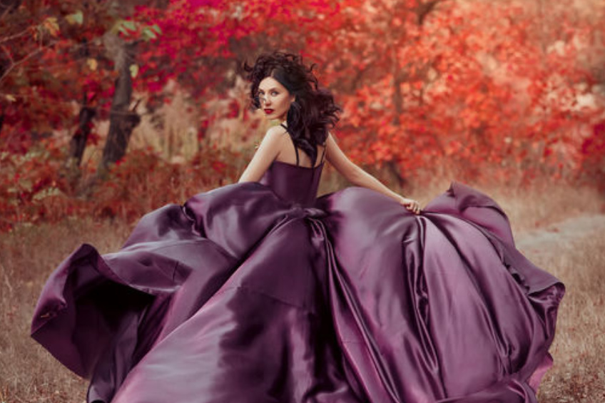 Lady in a luxury lush purple dress ,fantastic shot,fairytale princess is walking in the autumn forest,fashionable toning,creative computer colors